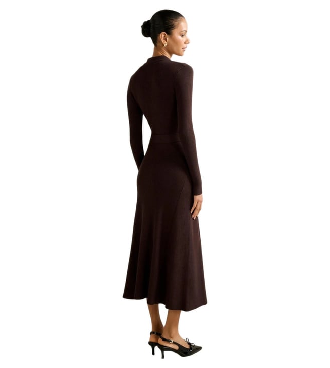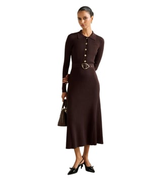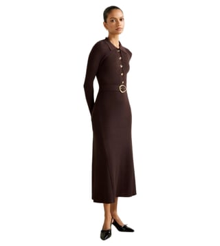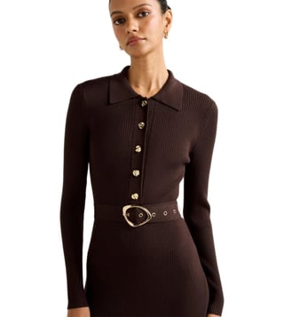 Elevate your wardrobe with the Forever New Kelani Petite Belted Midi Dress. This figure-flattering fit-and-flare silhouette features a sleek collar, gold-tone button detailing, and a wide belt for a comfortable fit. Made with branded viscose sourced from sustainably managed forests, this dress offers a beautiful drape and all-over ribbed texture. With long fitted sleeves and a subtle flared hem, this dress is perfect for any occasion. Update your look with this timeless piece that combines feminine glamour with quality craftsmanship.