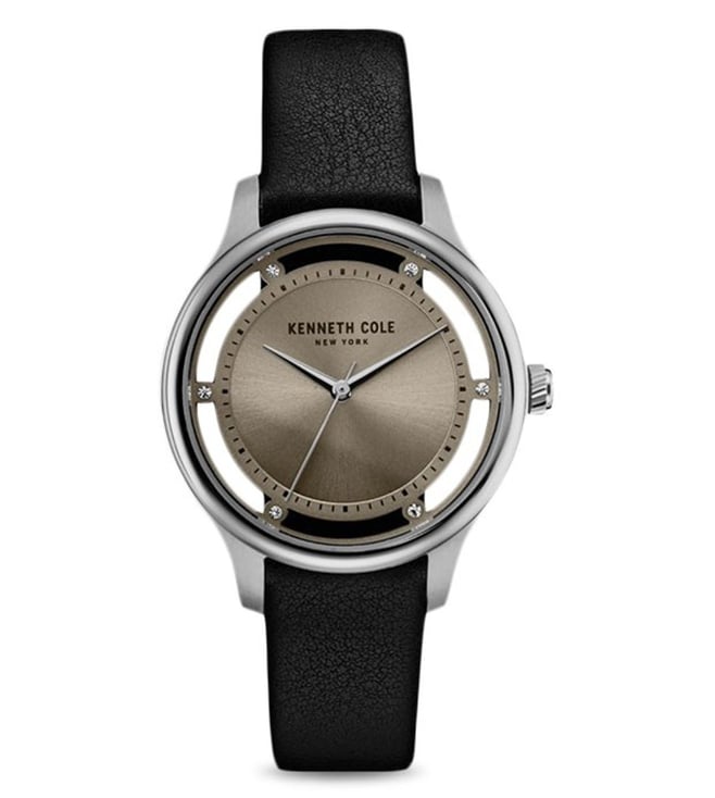 Designed to perfection, this womens analog watch from Kenneth Cole is a must-have. Its genuine leather strap showcases a stunning black hue that uplifts the look of the watch. Functional on a quartz movement, the antique gold round dial exudes plain three hands, stick minute markings, stone studded hour markings at ten-minute intervals and a crown for time adjustment.