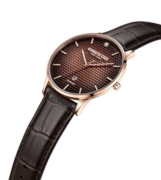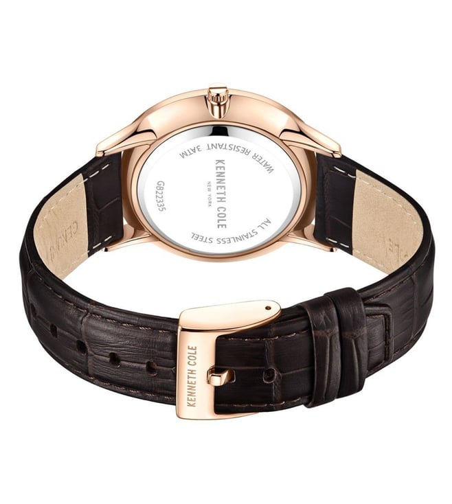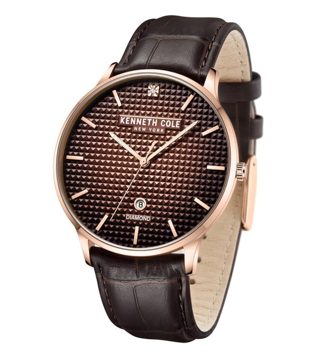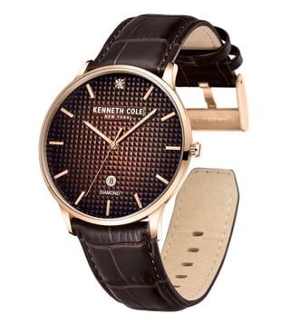 Look modish by donning this men's analog watch from the collection by KENNETH COLE. The brown round dial is protected by a mineral glass. It features a crown for time adjustment. The metal strap comes in a brown hue that further elevates the look of the timekeeper. Besides, it is completed with a buckle clasp to ensure a secure fit on the wrist.