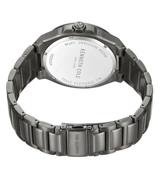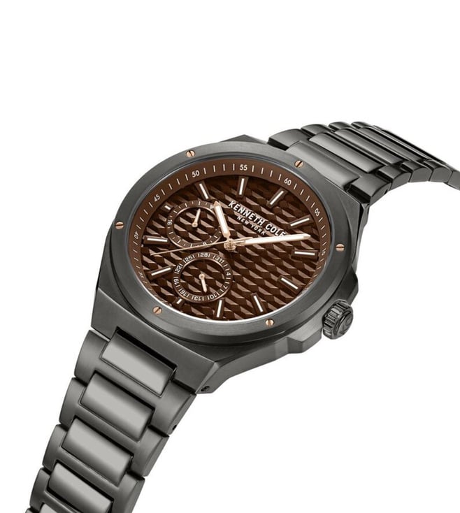 Look modish by donning this men's analog watch from the collection by KENNETH COLE. The brown round dial is protected by a mineral glass. It features a crown for time adjustment. The metal strap comes in a grey hue that further elevates the look of the timekeeper. Besides, it is completed with a push button clasp to ensure a secure fit on the wrist.