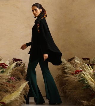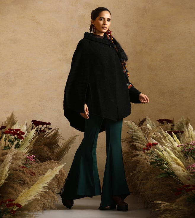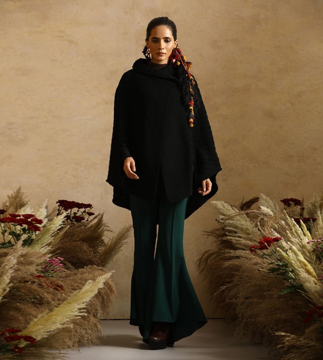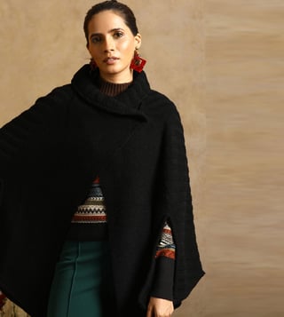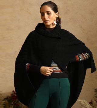 Discover the KHALEEJ Cloak in elegant black wool, designed for women. Perfect for casual wear, this stylish piece adds a touch of warmth and sophistication to your wardrobe. Disclaimer: All other items in the image are only for display purposes and will not be a part of the delivery content. Product colour may slightly vary due to photographic lighting sources. Country of Origin - India.