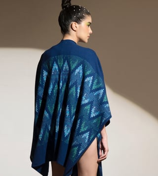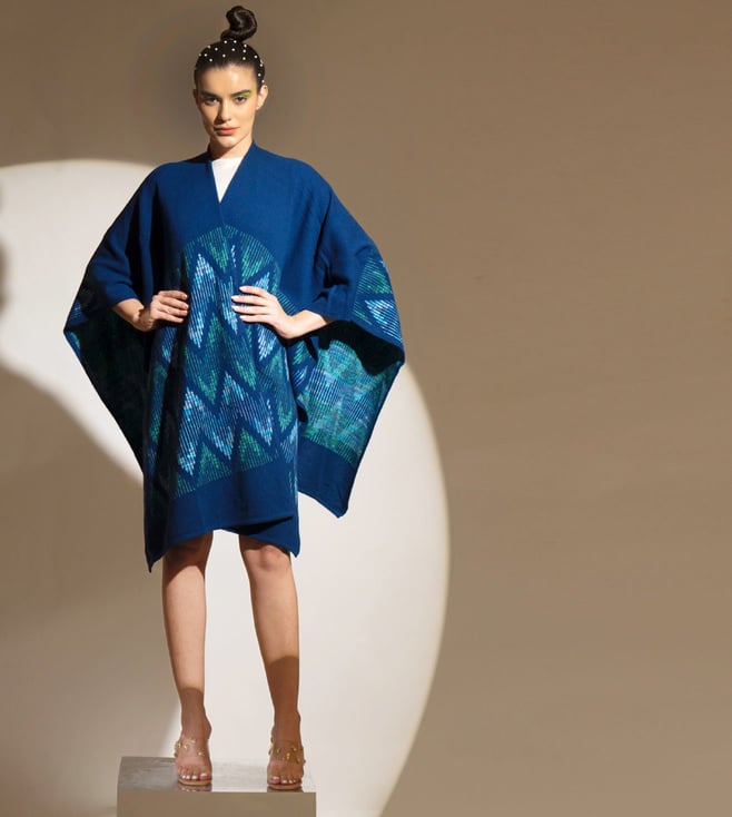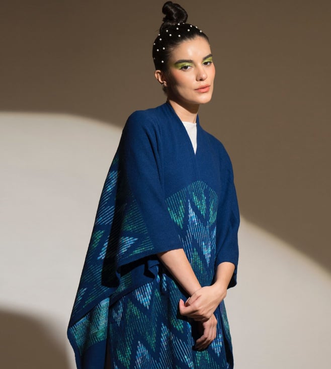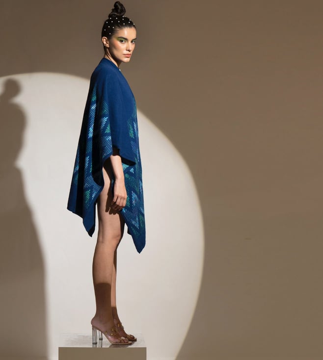 Explore elegance with the KHALEEJ Cape in blue, crafted from cozy wool. Perfect for casual wear, this stylish piece is designed for women seeking comfort and sophistication. Disclaimer: All other items in the image are only for display purposes and will not be a part of the delivery content. Product colour may slightly vary due to photographic lighting sources. Country of Origin - India.