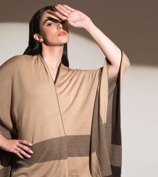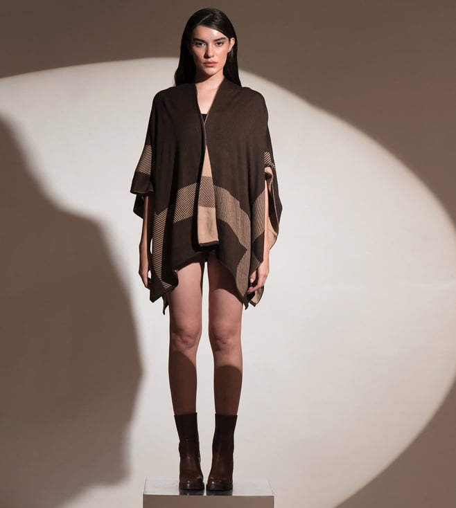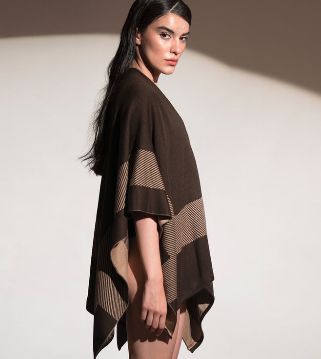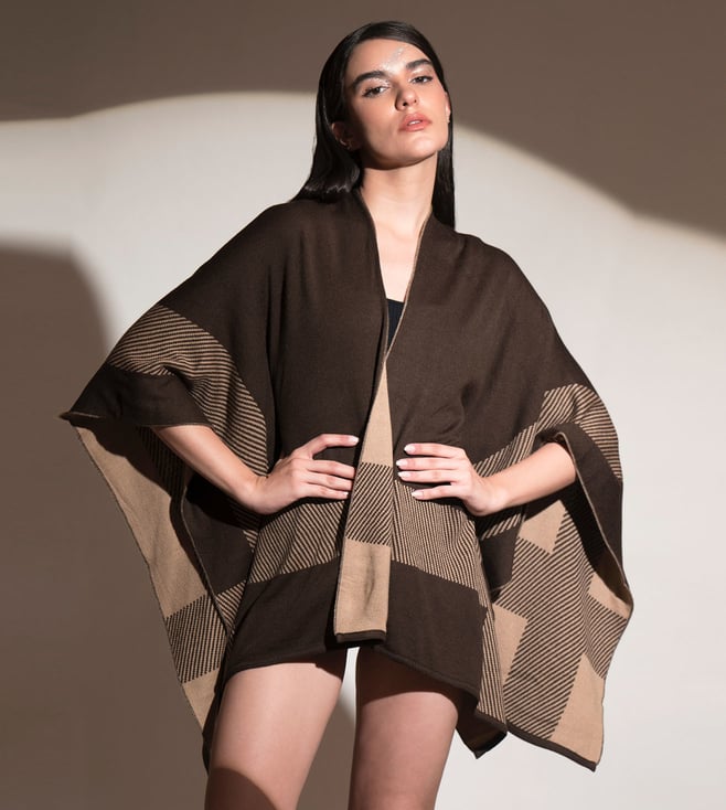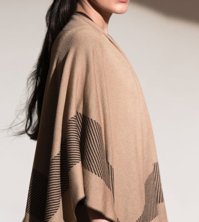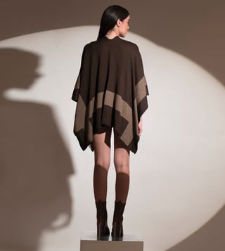 The KHALEEJ Cape in multi-colour features a stylish tiger's eye design, crafted from soft wool. Ideal for women's casual wear, it adds elegance to everyday outfits. Disclaimer: All other items in the image are only for display purposes and will not be a part of the delivery content. Product colour may slightly vary due to photographic lighting sources. Country of Origin - India.
