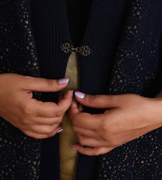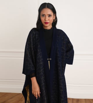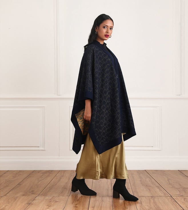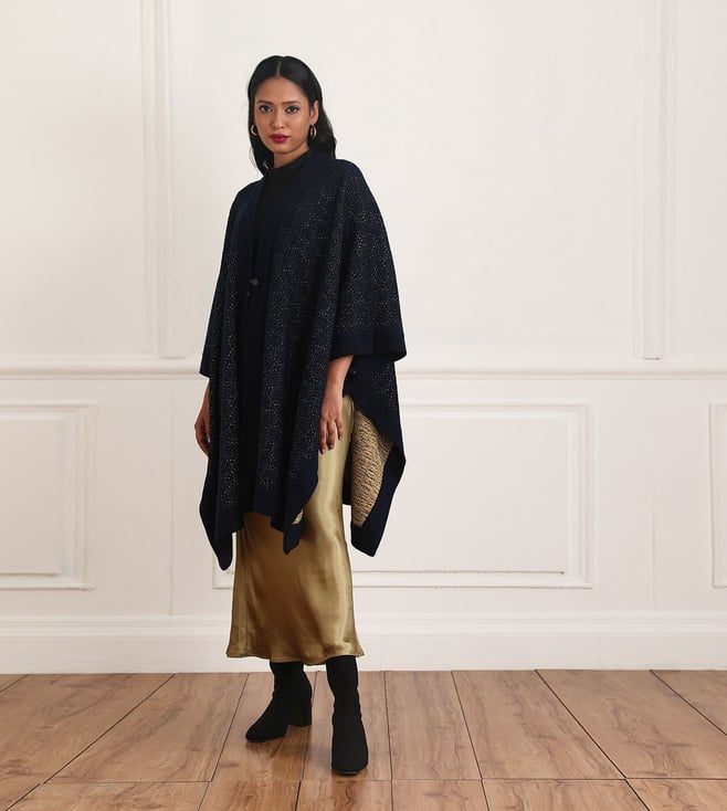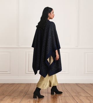 The KHALEEJ Cape-Beatrice in navy offers a stylish casual option for women. Crafted from warm wool, it combines comfort and elegance for everyday wear. Disclaimer: All other items in the image are only for display purposes and will not be a part of the delivery content. Product colour may slightly vary due to photographic lighting sources. Country of Origin - India.