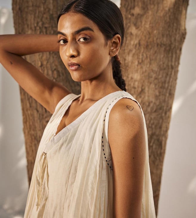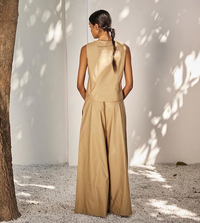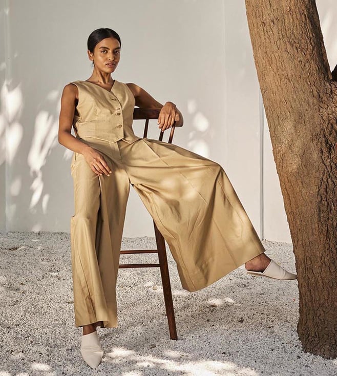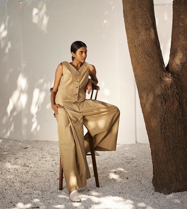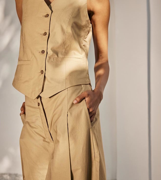 Achieve a magnetic look by wearing this twill cotton co-ord set with a classic waistcoat with two front pockets and flared pleated trousers with side seam pockets and a front button opening. It is handcrafted in India. Disclaimer: Product colour may slightly vary due to photographic lighting sources. Country of Origin - India.