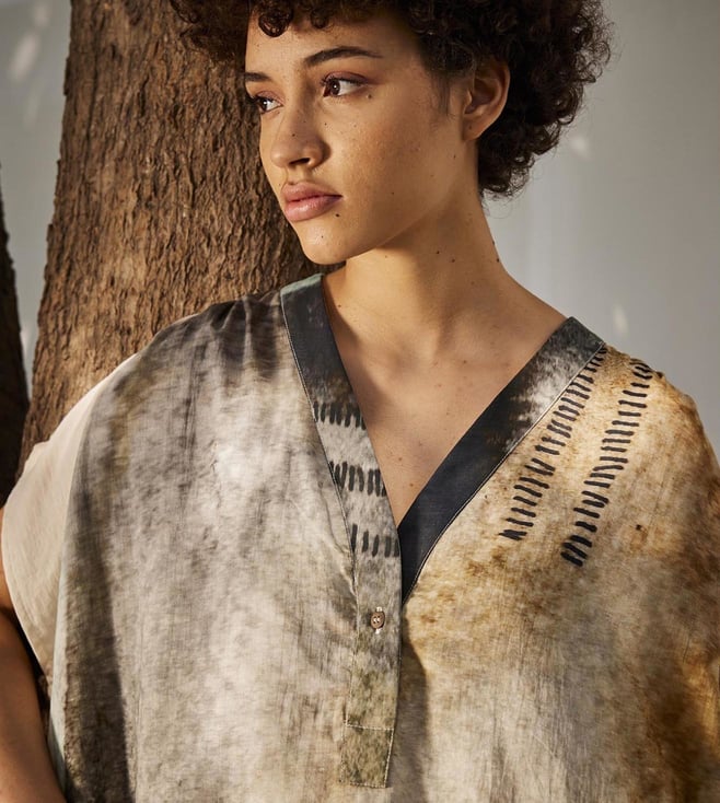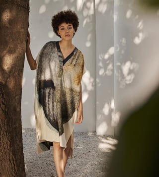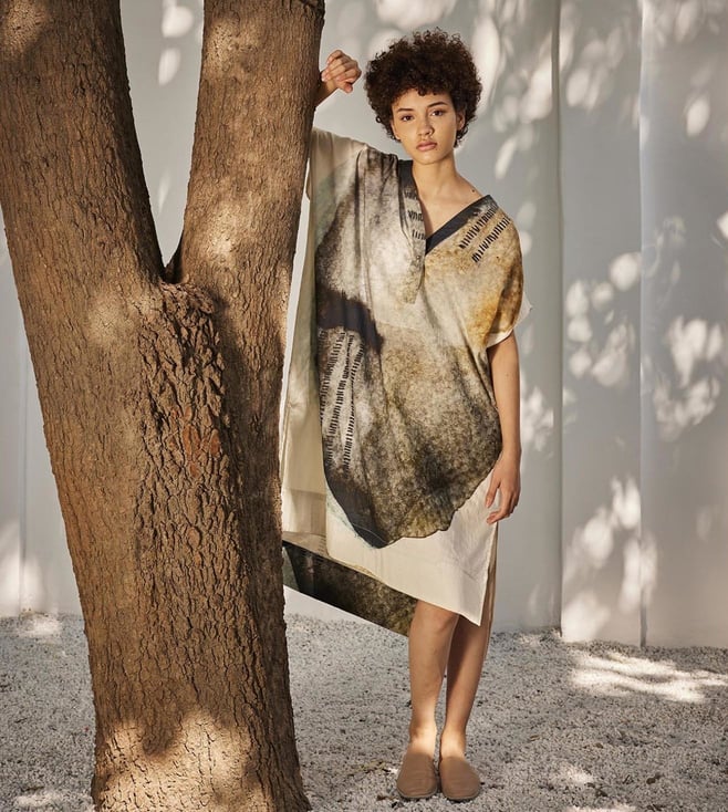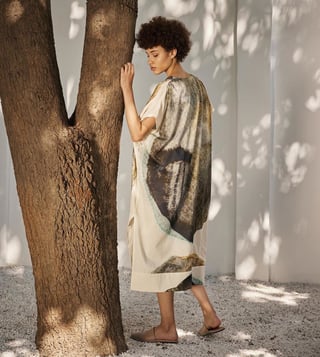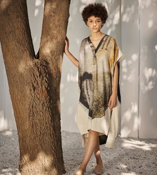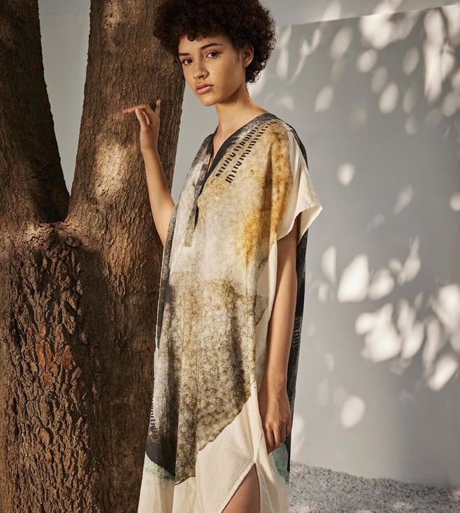 Rekindle your inner beauty by wearing this kaftan dress made of mul-cotton. It comes with a front button opening and a side slit and gathers at the shoulder. It is handcrafted in India and is fully lined. Disclaimer: Product colour may slightly vary due to photographic lighting sources. Country of Origin - India.