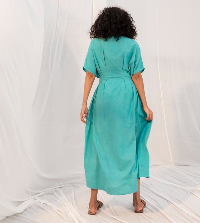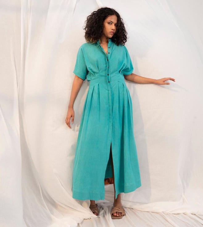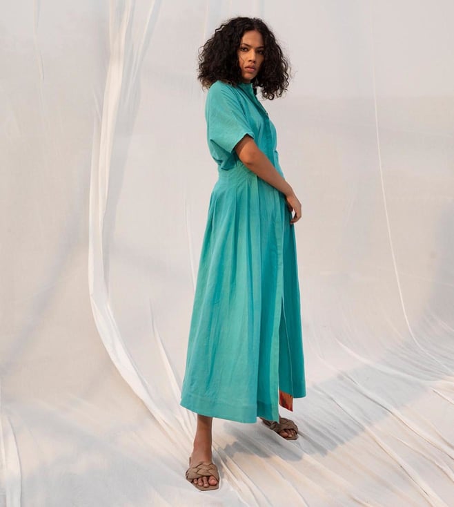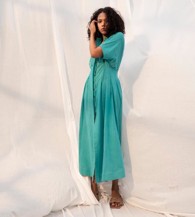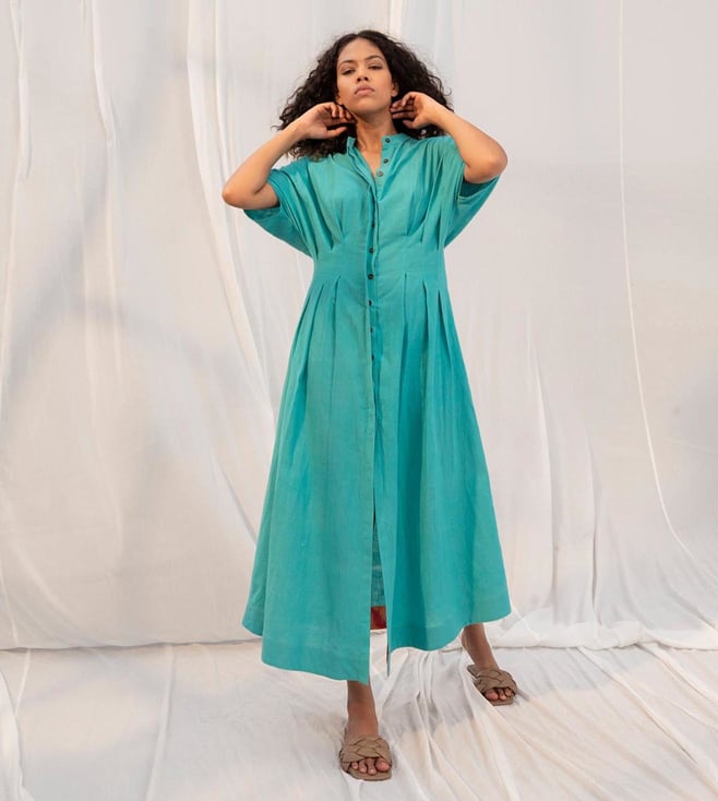 Twirl in transition wearing this turquoise button-down dress from Kharakapas with pleats on front and back. It is made using handloom cotton. It has ikat detailing on the inside. Also, it has no lining. Disclaimer: Product colour may slightly vary due to photographic lighting sources. Country Of Origin - India.
