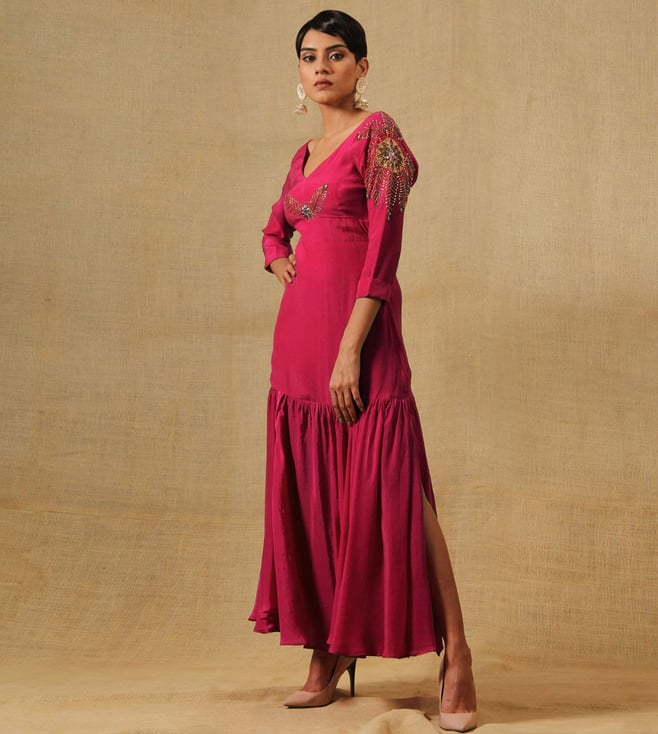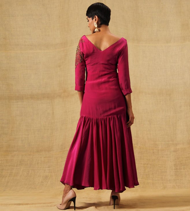 The Khusboo & Pankaj Fuchsia Pink Silk Crepe Regular Fit Embroidery Casual Dress This women's Casual Dress combines traditional fabric with vibrant colors for a unique style. Disclaimer: All other items in the image are only for display purposes and will not be a part of the delivery content. Product colour may slightly vary due to photographic lighting sources. Country of Origin - India.