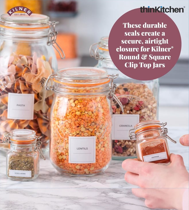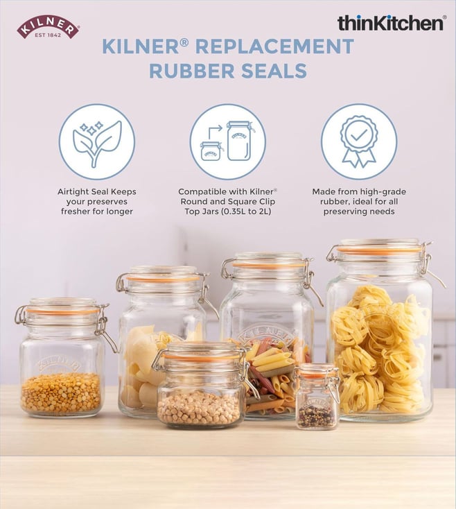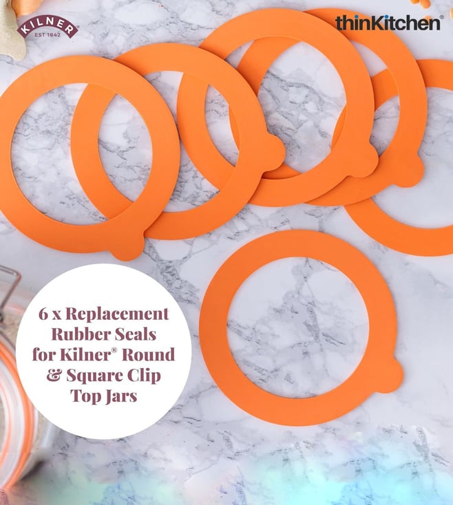 Kilner Replacement Rubber Seals (Set of 6) Made from durable, food-safe rubber to ensure airtight sealing on Kilner Round & Square Clip Top Jars (0.35L 2L). Hand wash & sterilise before use.