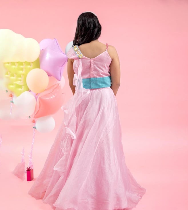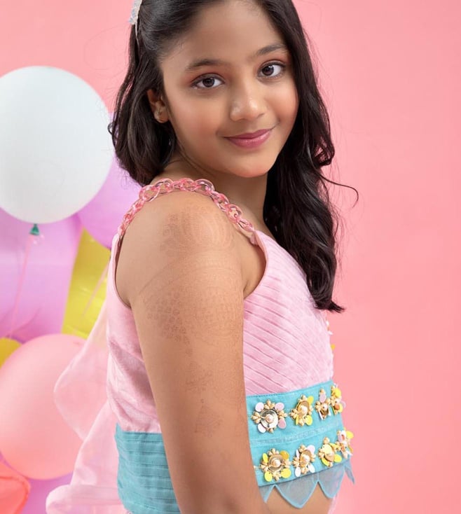 Rev up your little one's wardrobe with this two-layered lehenga with an attached dupatta and hand-embroidered crop top. The pleated organza crop top has a strappy neck. The organza lehenga comes with an attached dupatta having handwork. It has been crafted with care using premium quality fabric. Disclaimer: Product colour may slightly vary due to photographic lighting sources. Country of Origin - India.