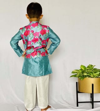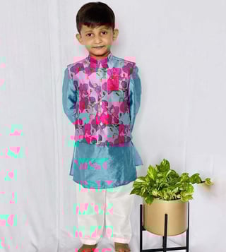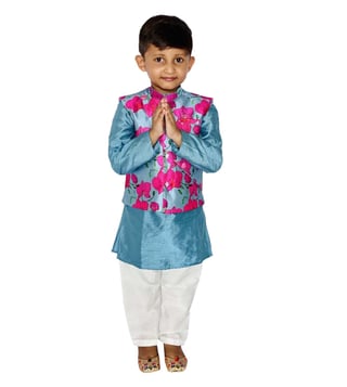 A melange of style and comfort, this kurta and pyjama set with bandi from Kirti Agarwal Pret n Couture will be an apt inclusion to your little boy's wardrobe. Tailored to sartorial perfection from cotton and silk, it assures a soft and soothing touch against the skin. It also comes with a soft cotton lining. Disclaimer: Product colour may slightly vary due to photographic lighting sources. Country Of Origin - India.