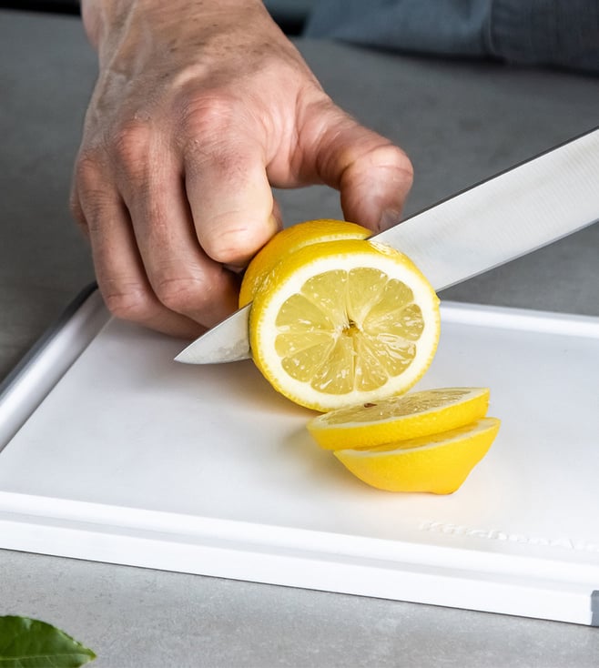The KitchenAid chopping board is expertly designed to provide an exceptional experience. This kitchen essential is also non-absorbent and reversible to double the cutting surface. It is dishwasher-safe for easy clean up and comes with a Lifetime Limited Warranty.
