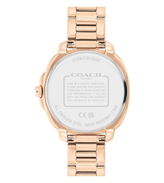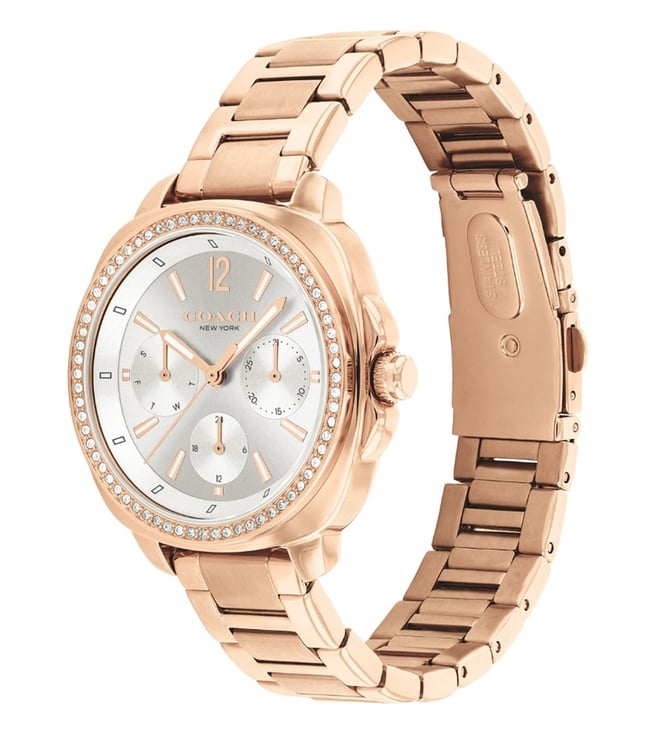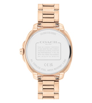 Designed to suit the preference of urban GENDER, this watch from the kitt collection by Coach is sure to make a style statement. The grey round dial is protected by a mineral glass. It exhibits analog and a crown for time adjustment. The stainless steel strap flaunts a rose gold hue that accentuates the look of the watch.