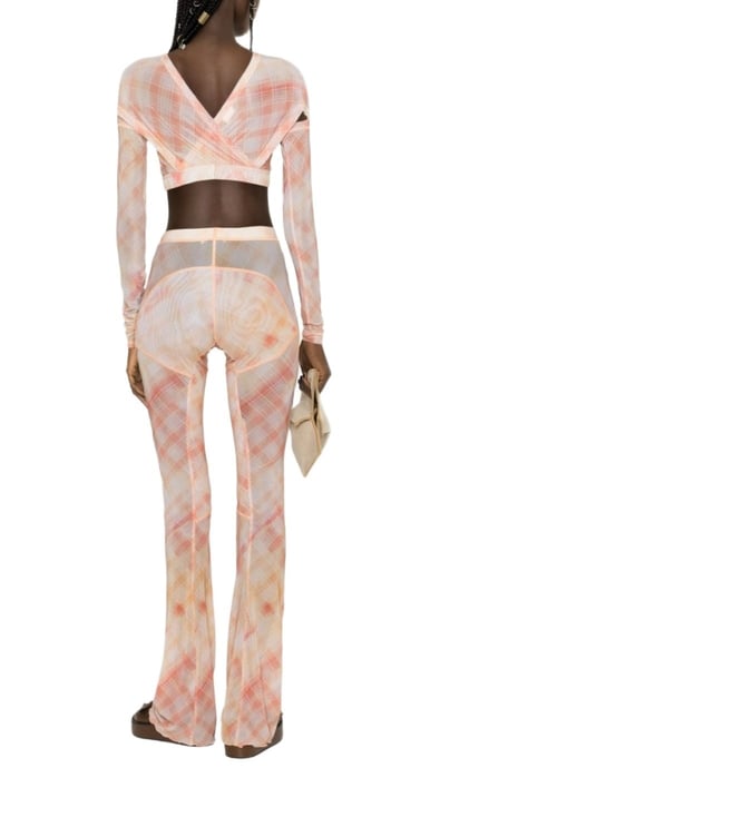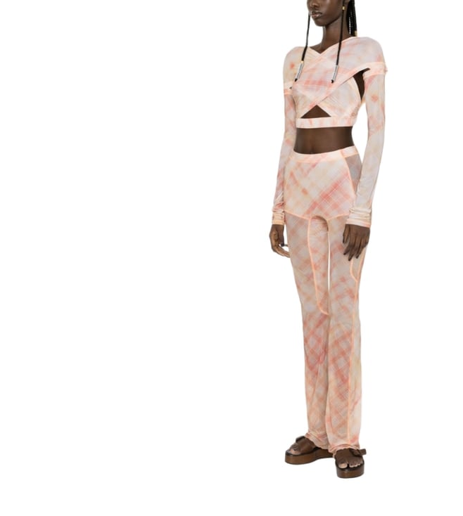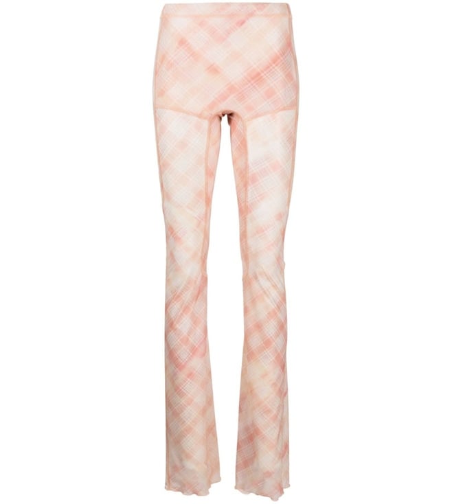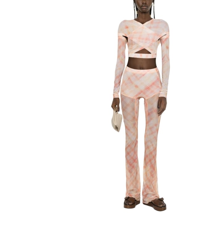 Elevate your wardrobe with the Knwls Peach Checked Flared Trackpants. Designed with patterned sheer trousers from knwls featuring orange, stretch-design, sheer, all-over graphic print, high waist and straight leg. this piece fits true to size. we recommend you get your regular size, model is 1, 75m / 5ft 8in wearing size s, these trousers combine comfort and sophistication for everyday wear.