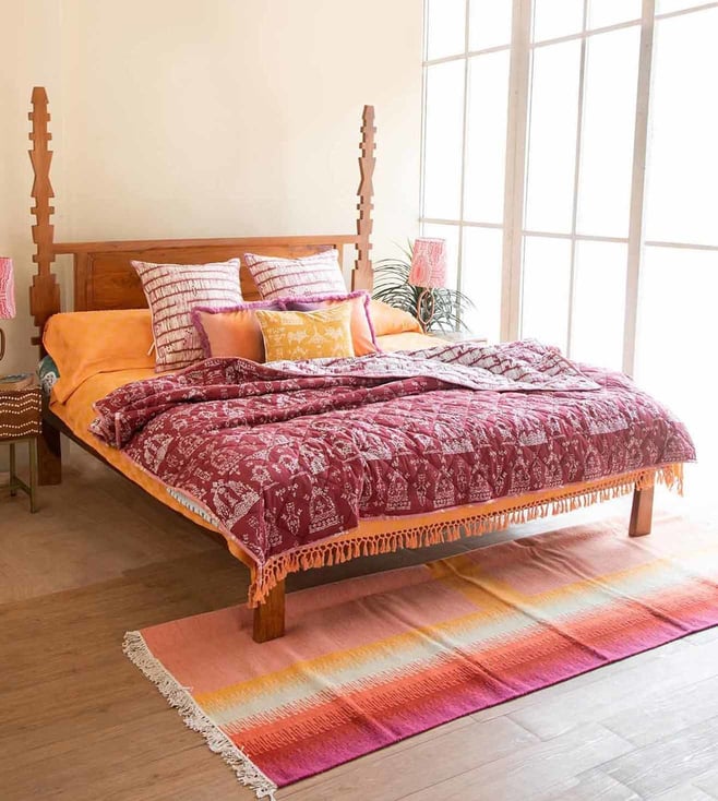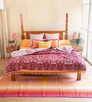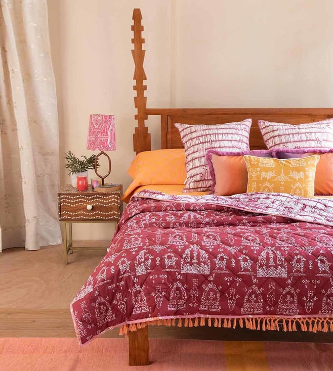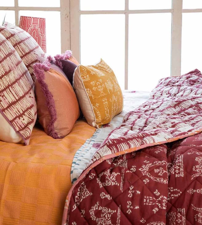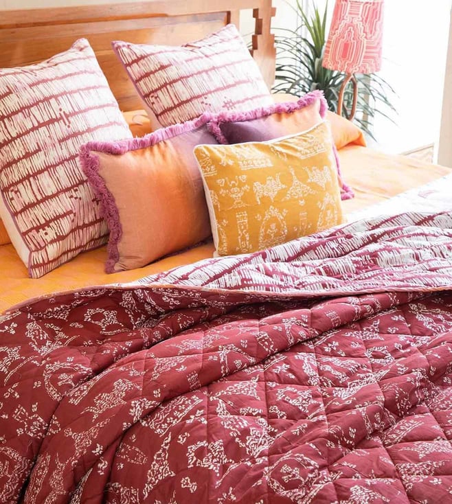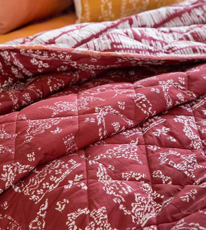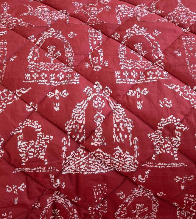 Find peace in your sanctuary with Freedom Tree's Madder Red Quilt, crafted from 100% Cotton Cambric fabric. Indulge in this timeless piece to make your home a cozy place to relax and reflect. Disclaimer: All other items in the image are only for display purposes and will not be a part of the delivery content. Product colour may slightly vary due to photographic lighting sources. Country of Origin - India.