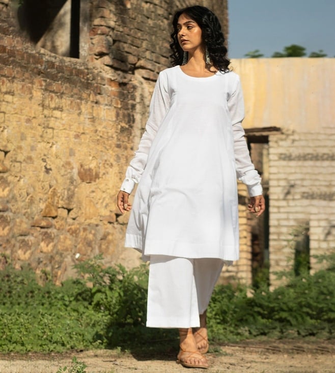 Kora White Cotton Round Neck Knee Length Anarkali Style Kurta With Palazzo Pants (set Of 2)