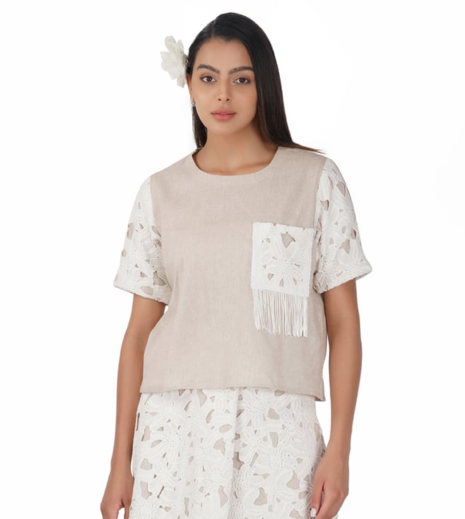 Beige & White Maleia Lacey Daisy Panelled Skirt