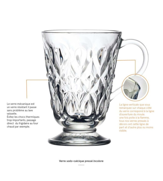 The perfect addition to any decor, this set of six Lyonnais mugs from the la rochere 19 th century collection is an absolute must-have. Stemmed mugs made from pressed glass and decorated with a sophisticated almond pattern inspired by the renaissance.