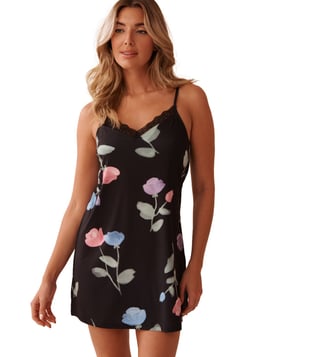Indulge in the epitome of elegance with our La Vie En Rose Black Recycled Fibers Trim Floral Chemise. Crafted from luxurious polyester, this daily essential features a flattering V-neck design and delicate floral trim, exuding charm and sophistication. Embrace sustainable fashion without compromising on style. Elevate your loungewear collection with this chic and environmentally conscious chemise, perfect for a touch of glamour in your everyday wardrobe.