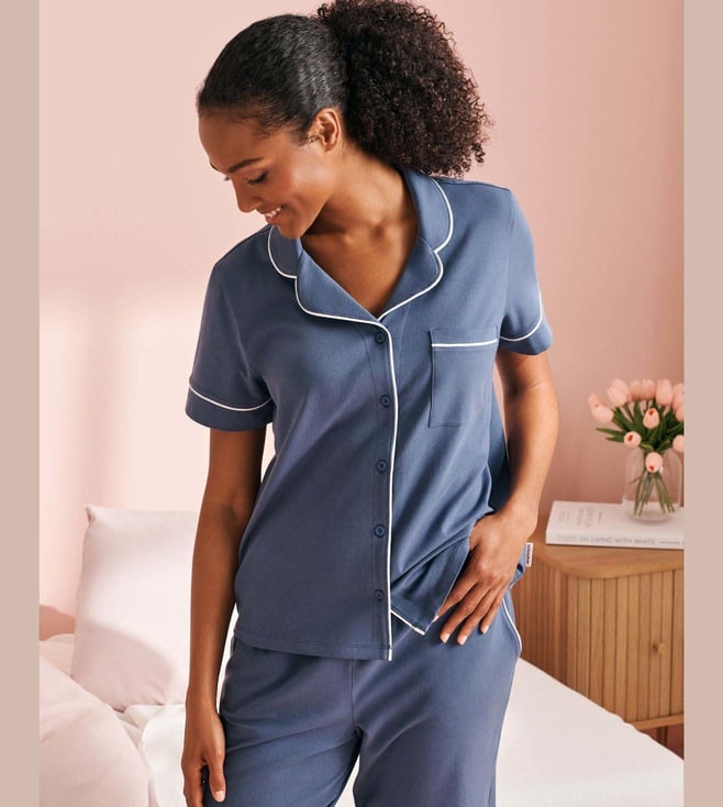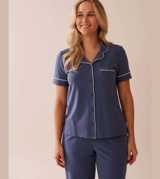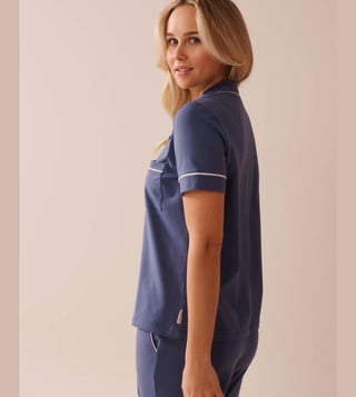 Revamp your wardrobe with this blue regular fit sleepwear shirt from La Vie En Rose. Tailored to sartorial perfection from premium quality fabric, it assures a soft and soothing touch against the skin. The shirt collar adds to its appeal. Exuding short sleeves, it is sure to fetch you compliments from all.