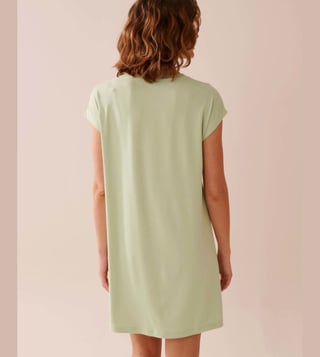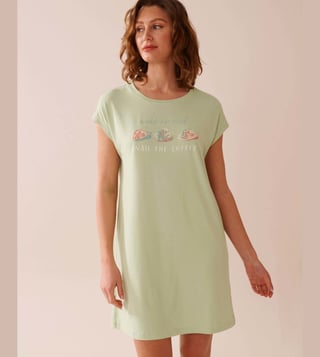 Achieve a splendid look by wearing this green regular fit sleepwear dress from La Vie En Rose. Tailored to sartorial perfection from premium quality fabric, it assures a soft and soothing touch against the skin. The round neck adds to its appeal. Exuding short sleeves, it is sure to fetch you compliments from all. The printed pattern makes it a captivating choice.