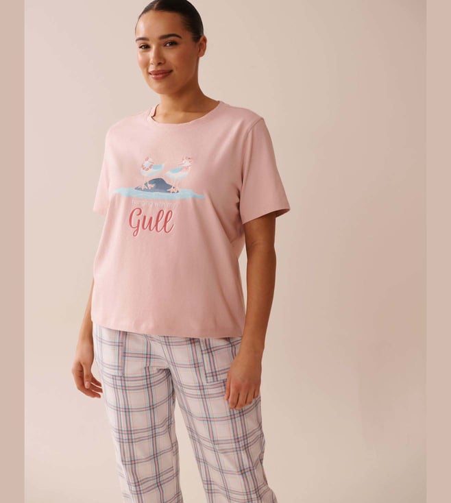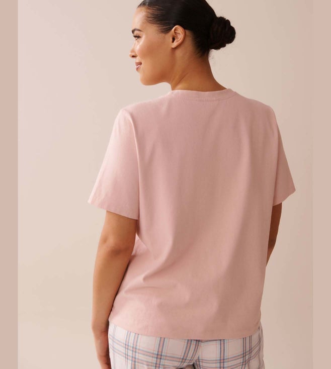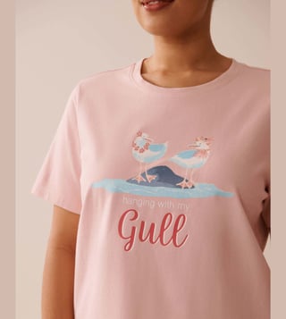 Channel a winning style by wearing this pink regular fit sleepwear t-shirt from La Vie En Rose. Tailored to sartorial perfection from premium quality fabric, it assures a soft and soothing touch against the skin. The round neck adds to its appeal. Exuding short sleeves, it is sure to fetch you compliments from all. The printed pattern makes it a captivating choice.