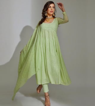 Let people applaud you for your impeccable choice as you don this glamorous anarkali kurta set. It comprises a beautiful anarkali kurta with mukaish work paired with pants and a matching dupatta. Add a little glam to your day when you wear this outfit. Please note: This piece is handmade with love and care by seasoned artisans and therefore slight differences in design and colour may occur from piece to piece. It has been created with care using premium quality georgette. Disclaimer: Product colour may slightly vary due to photographic lighting sources. Country of Origin - India.