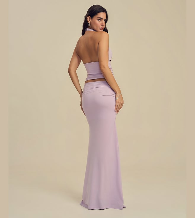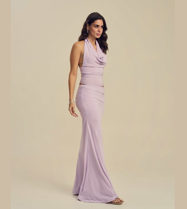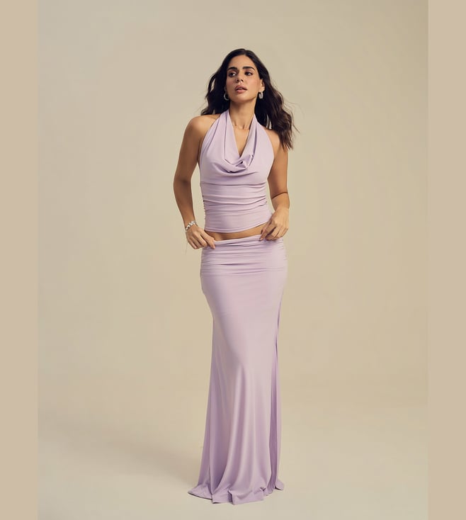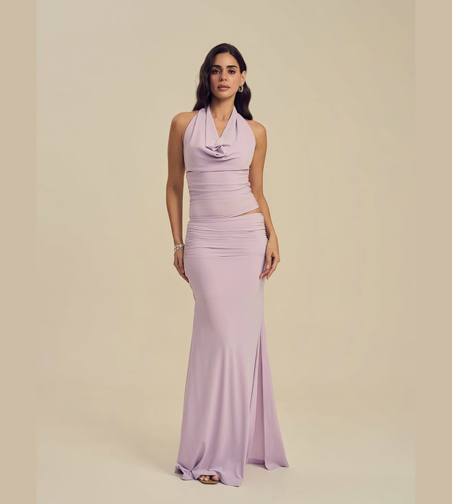 Miley a statement halter top in soft lavender, this look blends glamour and comfort with a draped neckline top perfect for evening occasions or modern resort chic.