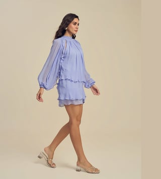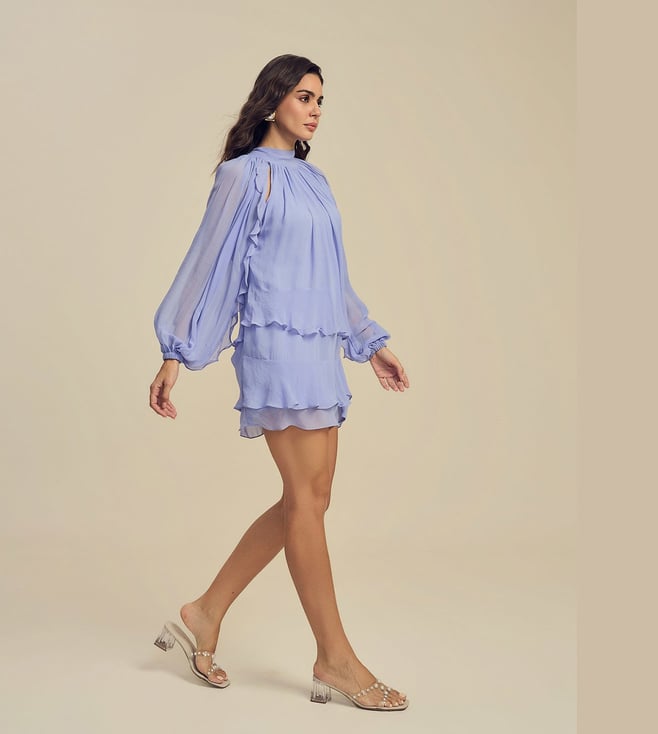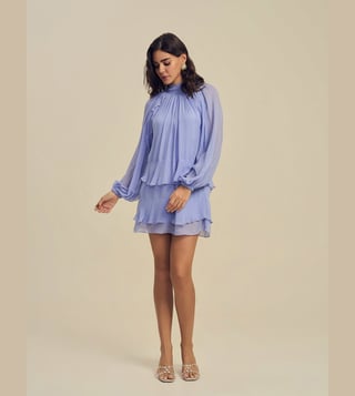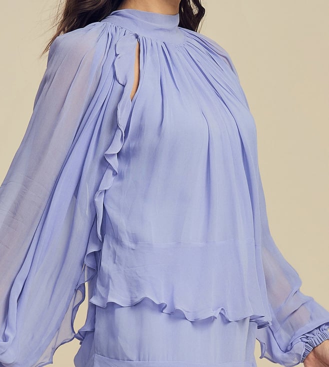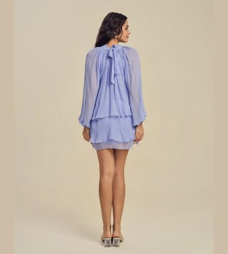 Maria soft lavender dress crafted from lightweight chiffon. It has voluminous bishop sleeves, a high neckline, and layered ruffle detailing that adds a romantic, flowy silhouette, it¿s perfect for elegant day or evening outings.