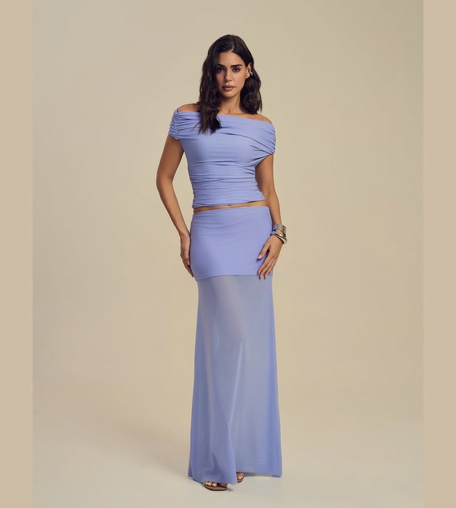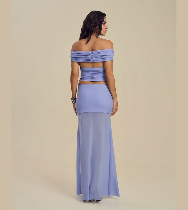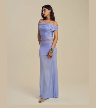 Shona sleek lavender sheer, floor-length skirt for a modern, elegant silhouette. The look balances structure and softness, perfect for evening glam or resort soir¿es.