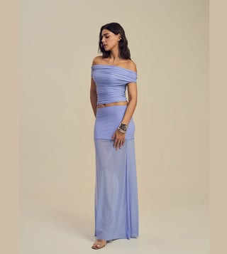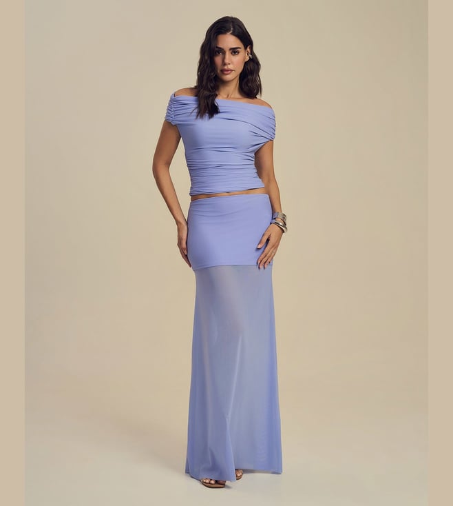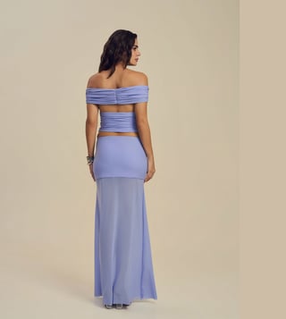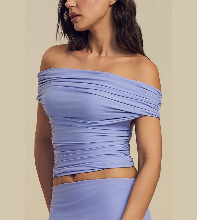Shona sleek lavender ruched off-shoulder crop top with modern, elegant silhouette. The look balances structure and softness, perfect for evening glam or resort soir¿es.