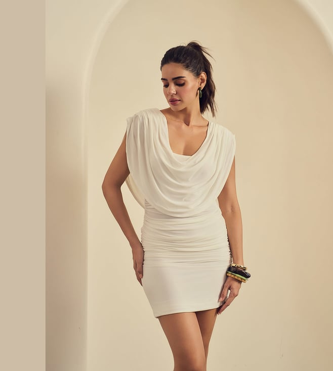 Aliyah white mini dress features a soft draped neckline and flattering ruching at the waist.Chic and minimal, it¿s perfect for an elegant yet effortless look.