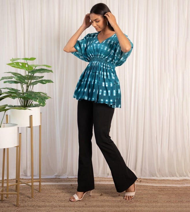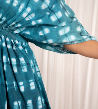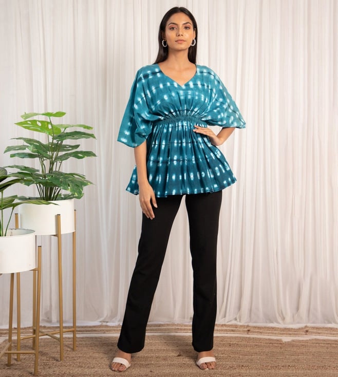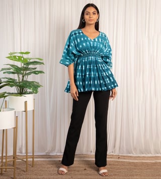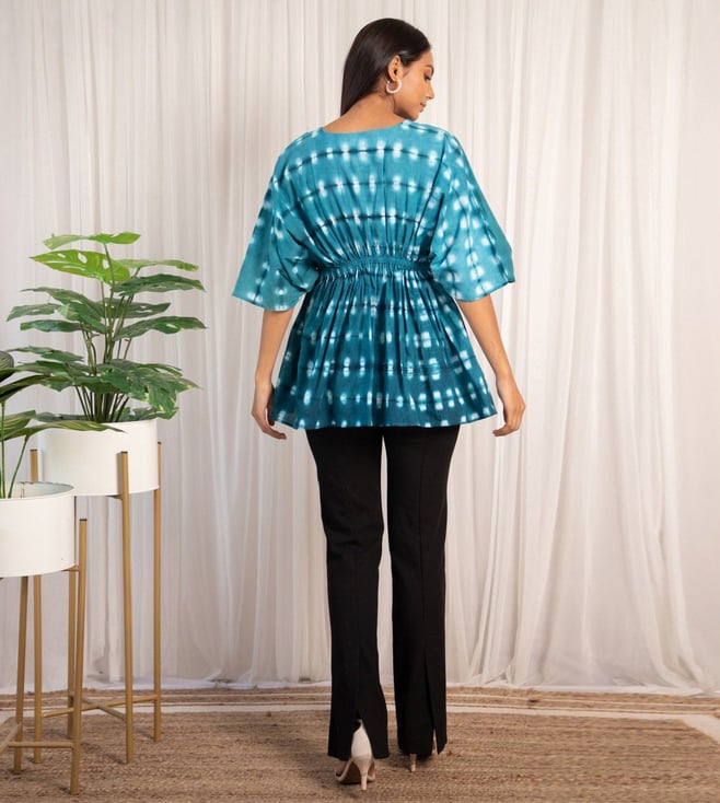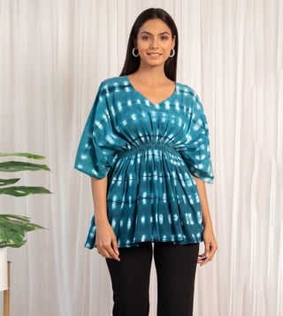 This kaftan top has been elasticated at waist. Flattering silhouette is suitable for all body types. It comes with hand done shibori tie-dye. It has been crafted with care using cotton. Disclaimer: All other items in the image are only for display purposes and will not be a part of the delivery content. Product colour may slightly vary due to photographic lighting sources. Country of Origin - India.