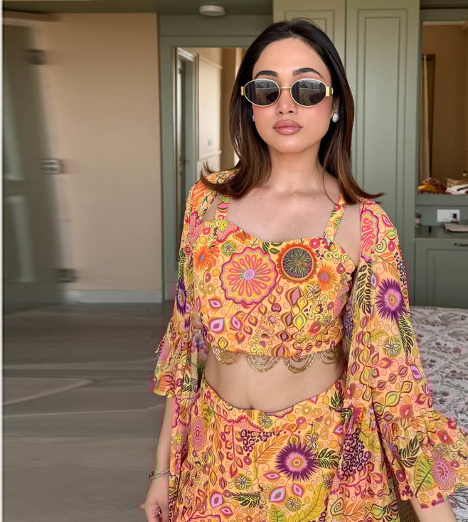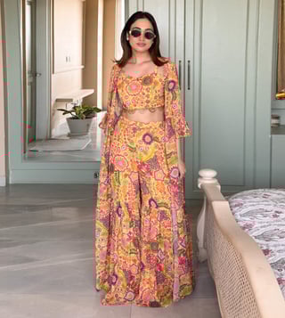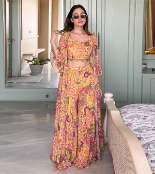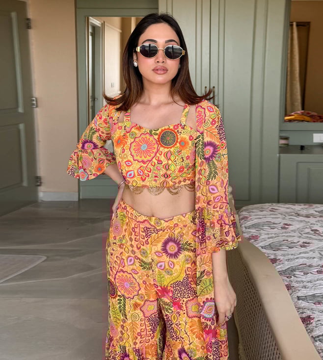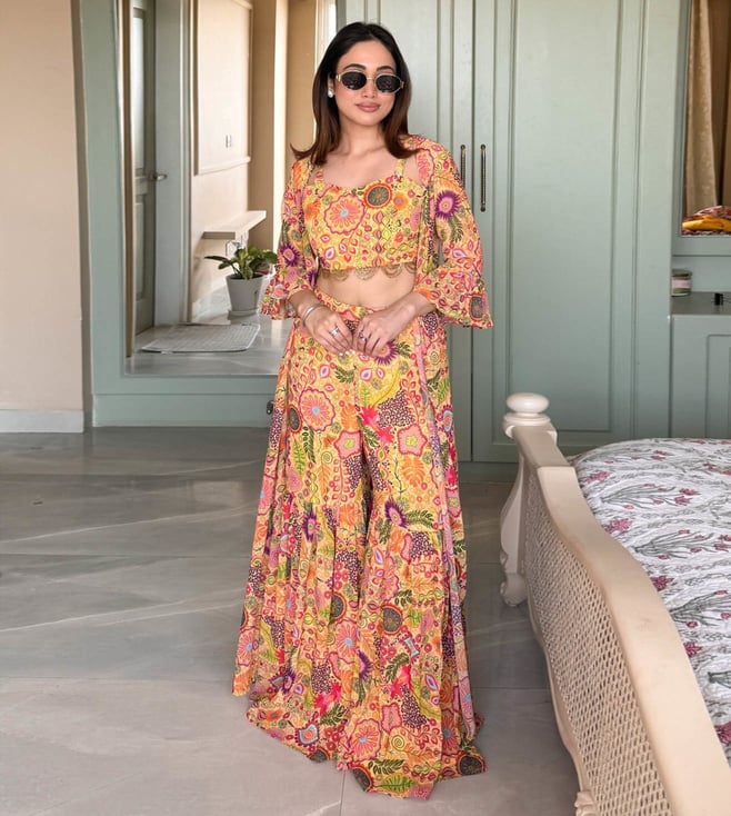 Label Kanupriya Yellow Georgette Slim Fit Floral Crop Top and Sharara Set with Jacket
