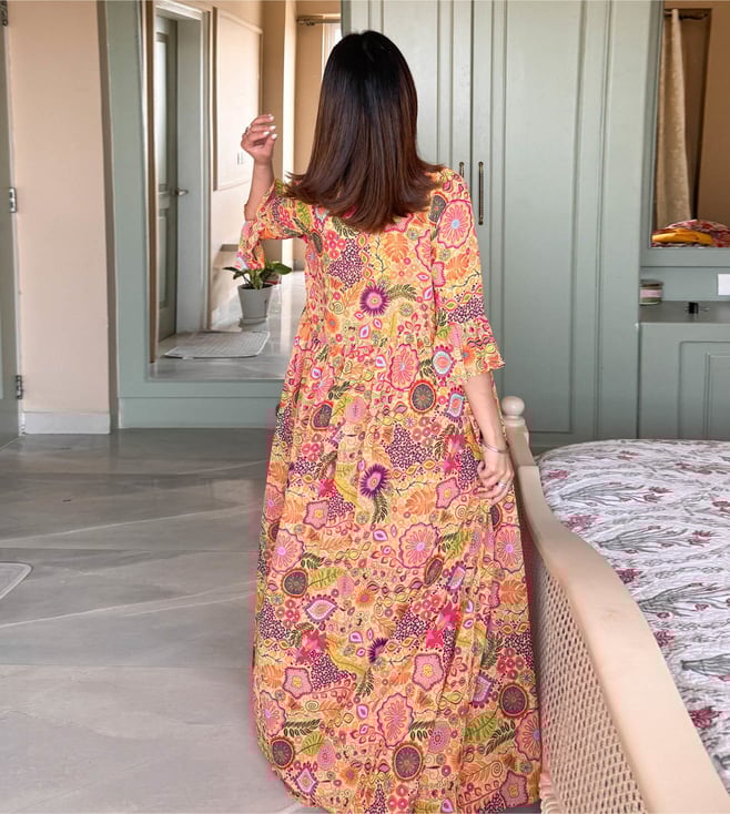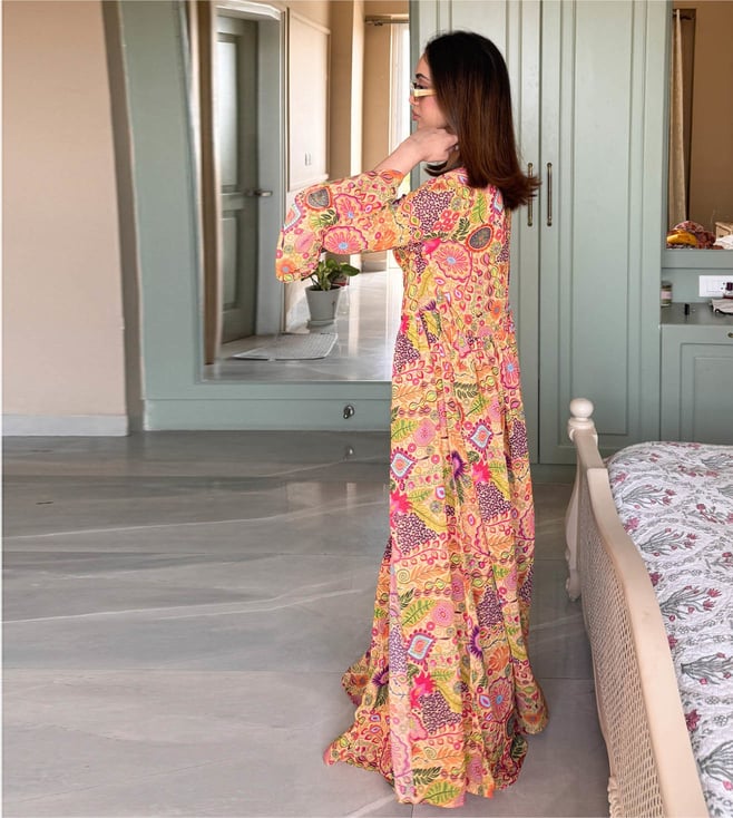 Straight Jacket in multicolor floral digital print. Waist down gathers in the jacket. Crop top has hanging golden cutdana lace detail on front. Sharara Pants in the same fabric.