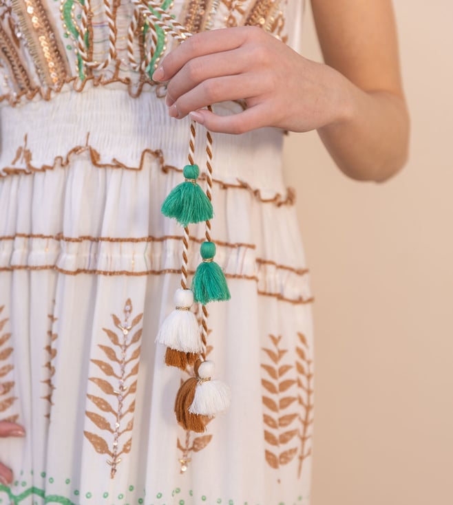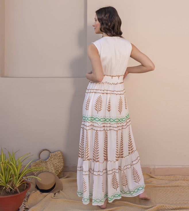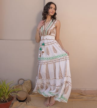 LABEL REYYA Riva Boho Ruffled Resort Maxi is a stylish and comfortable dress perfect for any occasion. Made from soft and breathable cotton reyon, this dress features a flowy silhouette with ruffled details. The brown color adds a touch of elegance, while the maxi length provides ample coverage. Disclaimer: All other items in the image are only for display purposes and will not be a part of the delivery content. Product colour may slightly vary due to photographic lighting sources. Country of Origin - India.