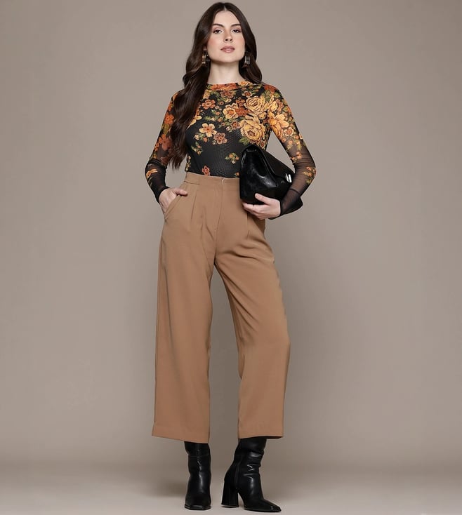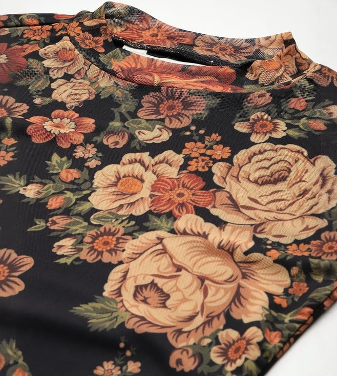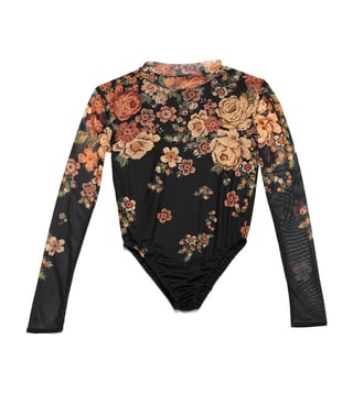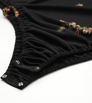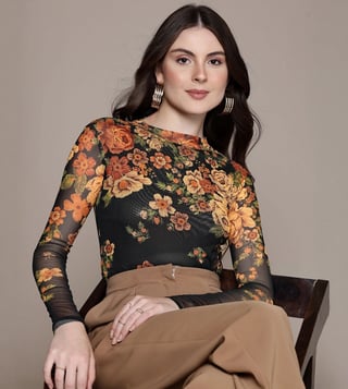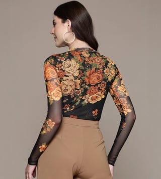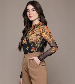 Add zest and zing to your look by wearing this black regular fit bodysuit from Label Ritu Kumar. Tailored to sartorial perfection from premium quality fabric, it assures a soft and soothing touch against the skin. The round neck adds to its appeal. The floral print makes it a bewitching choice.