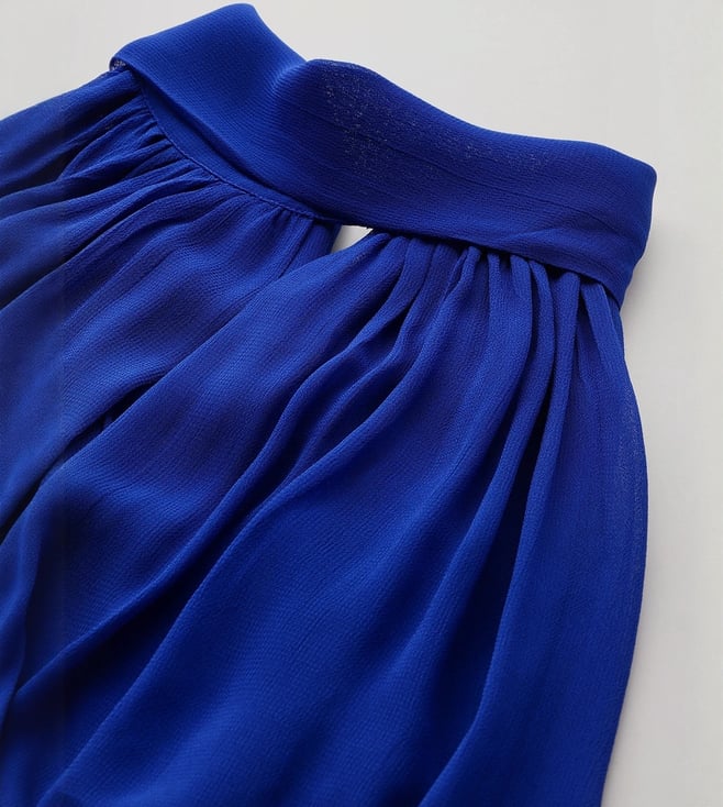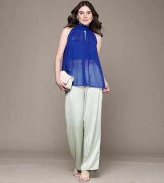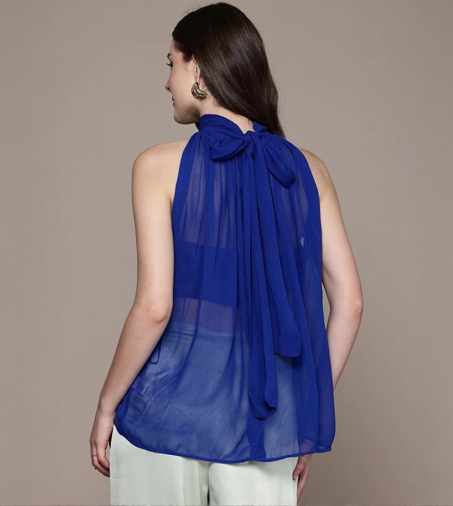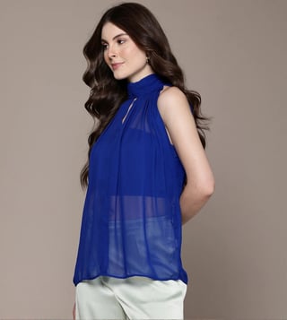 Give your wardrobe a stylish lift with this blue high neck regular fit sleeveless top from Label Ritu Kumar. Tailored to sartorial perfection from premium quality fabric, it assures a soft and soothing touch against the skin.