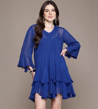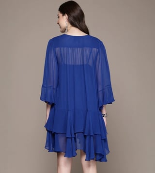 Make a head-turning statement by wearing this blue relaxed fit dress from Label Ritu Kumar. Tailored to sartorial perfection from premium quality fabric, it assures a soft and soothing touch against the skin. The V-neckline adds to its appeal.