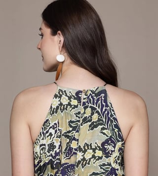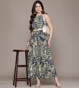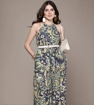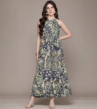 Curate a stunning look by wearing this green regular fit sleeveless jumpsuit from Label Ritu Kumar. Tailored to sartorial perfection from premium quality fabric, it assures a soft and soothing touch against the skin. The round neck adds to its appeal. The printed pattern makes it a captivating choice.