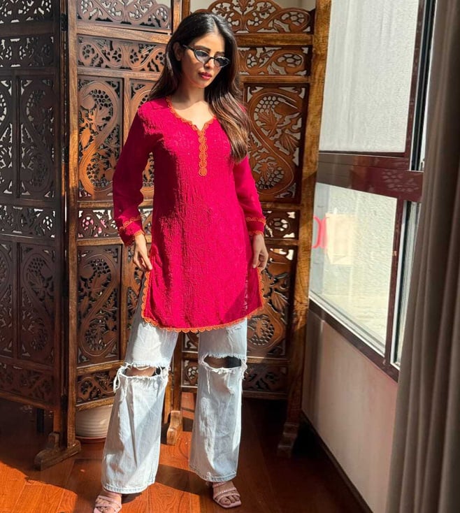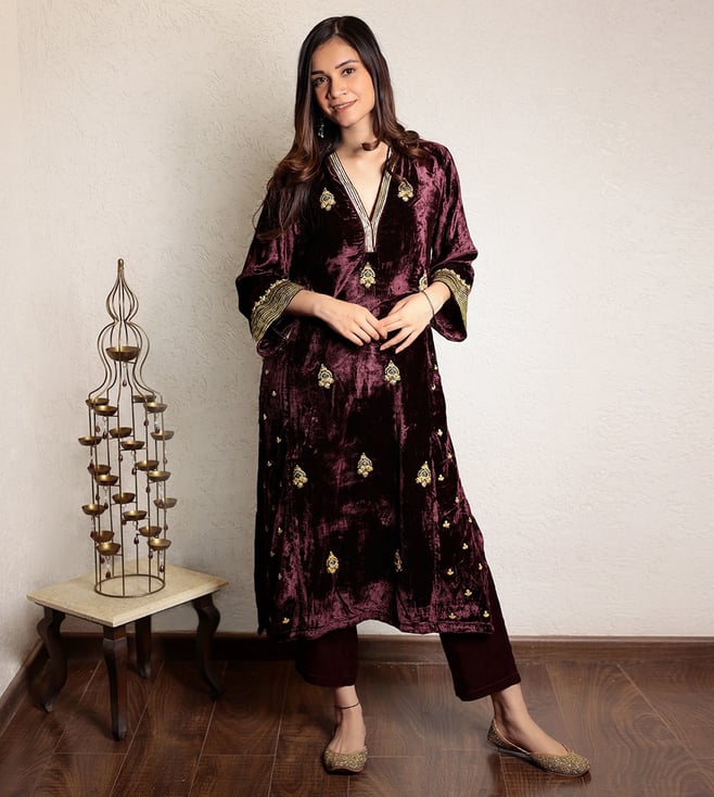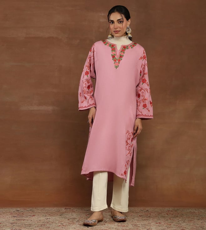 Pink Wool Regular Fit Embroidered Long Kurta