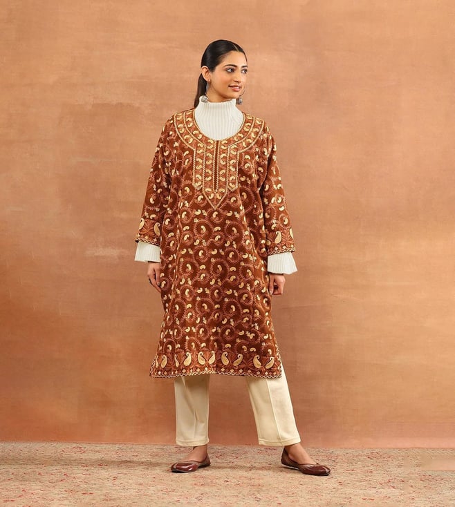 Brown Straight Fit Embroidered Kurti