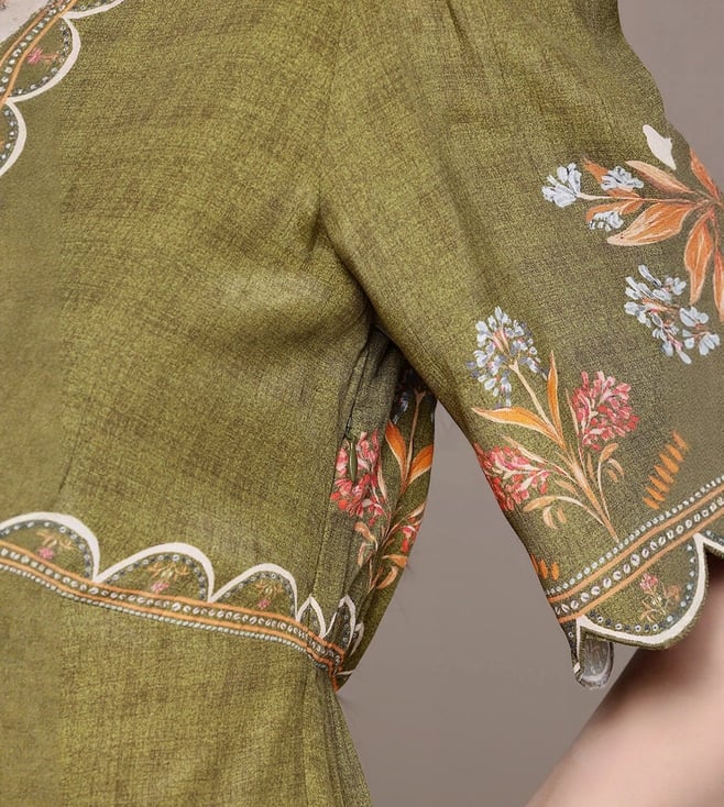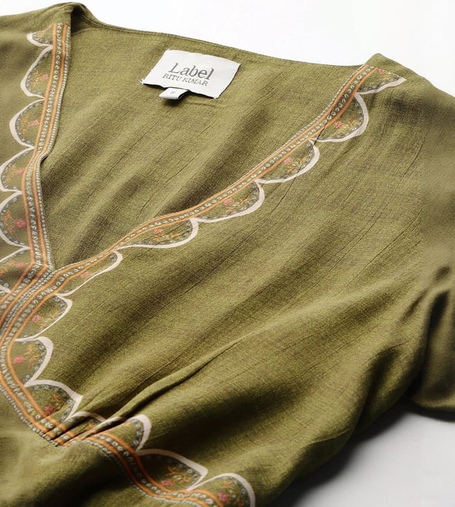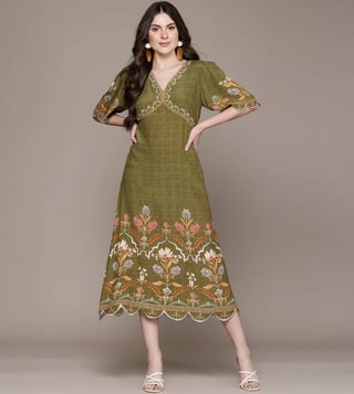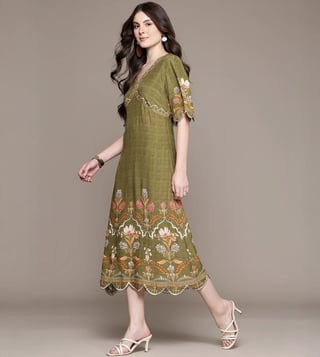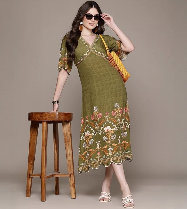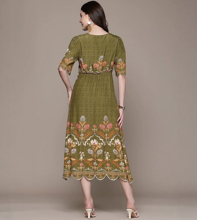 Label Ritu Kumar Olive Regular Fit Floral Print Dress
