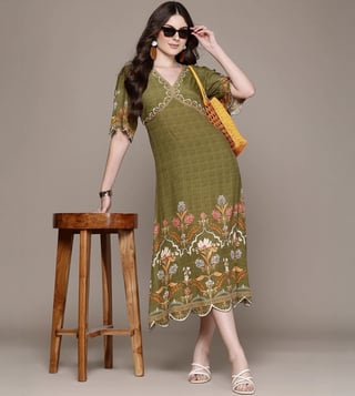 Score high on the fashion meter by wearing this olive regular fit dress from Label Ritu Kumar. Tailored to sartorial perfection from premium quality fabric, it assures a soft and soothing touch against the skin. The V-neckline adds to its appeal. Exuding short sleeves, it is sure to fetch you compliments from all. The floral print makes it a bewitching choice.
