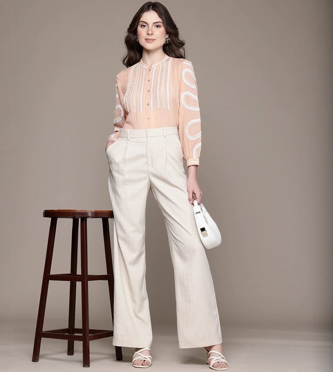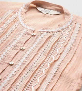 Get hold of a refreshing look by donning this peach relaxed fit top from Label Ritu Kumar. Tailored to sartorial perfection from premium quality fabric, it assures a soft and soothing touch against the skin. The mandarin collar augments its design. The embroidery work speaks for its ornate artistry.