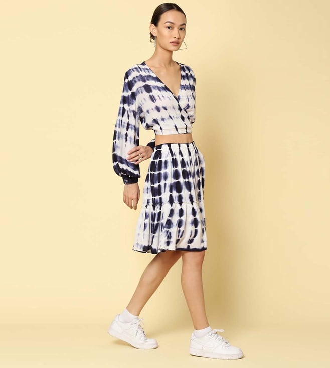 Give your weekend wardrobe a contemporary twist with this V-neck full-sleeved crop top with a flared skirt from Label Ritu Kumar. The abstract pattern makes it an alluring choice. It is crafted using rayon crepe and rayon crepe. Disclaimer: Product colour may slightly vary due to photographic lighting sources. Country Of Origin - India.