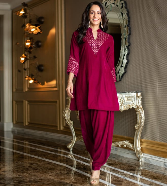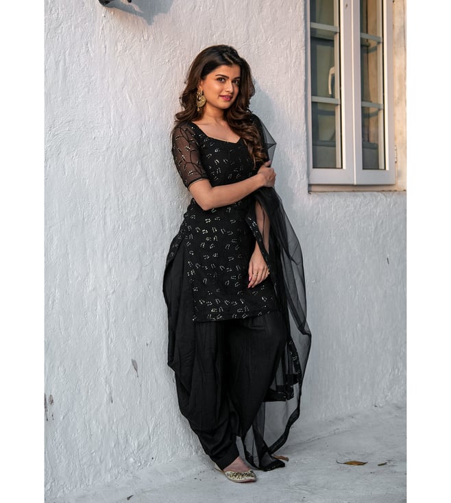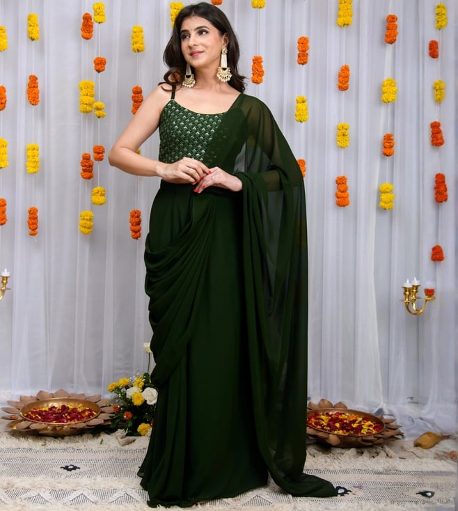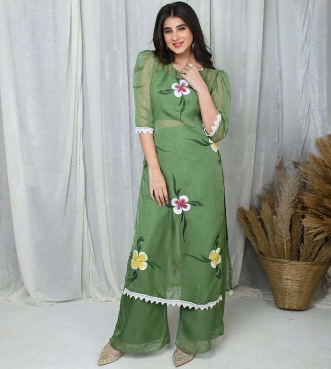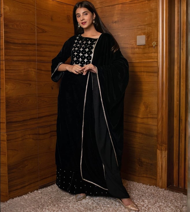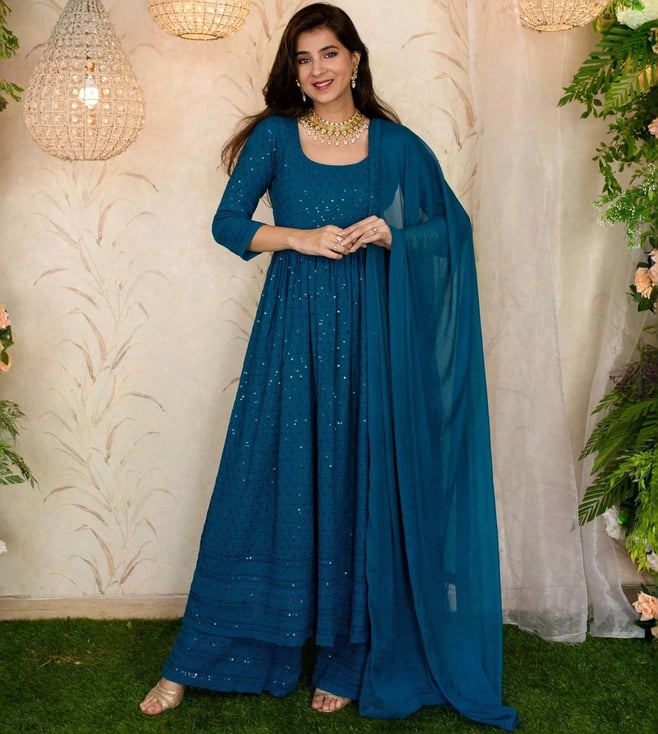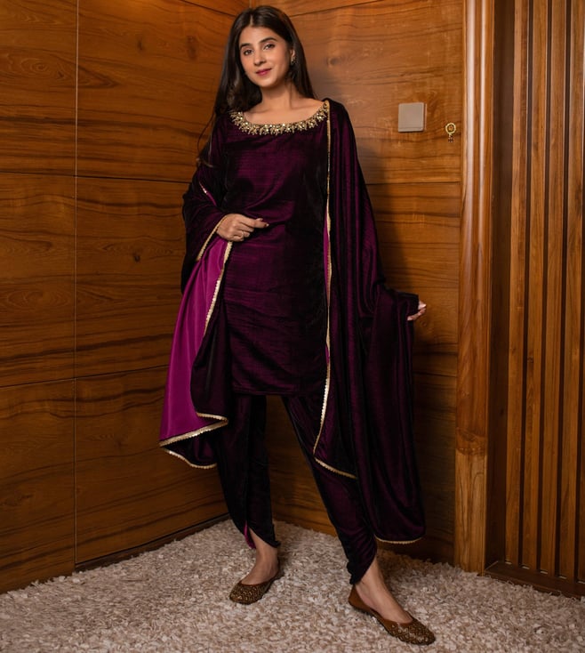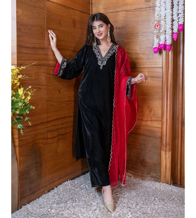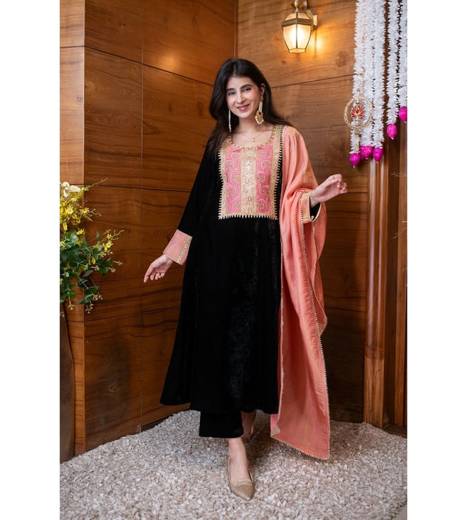 Bottle Green Velvet A Line Kurta with Pant and Dupatta
