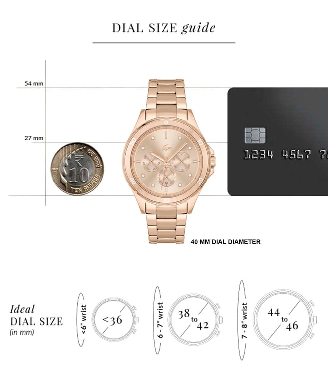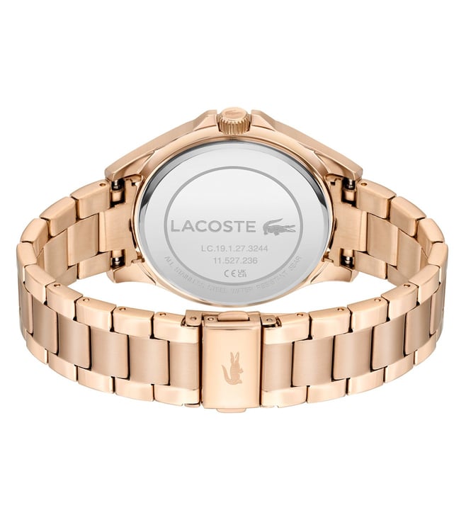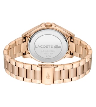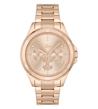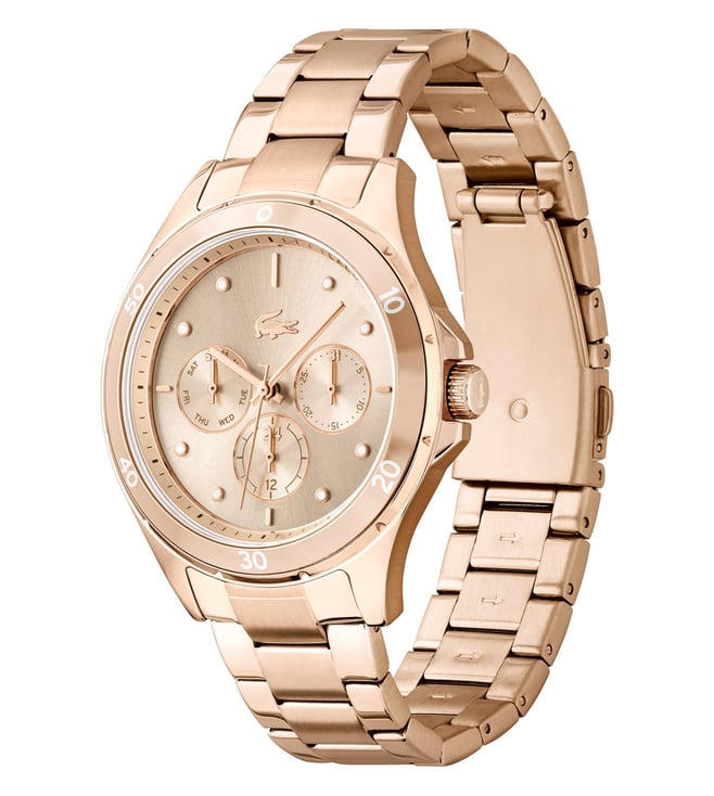 The multifunction Lacoste swing brings sports-inspired elements together with an exceptionally feminine design. Its printed bezel in brushed aluminium is presented in an elegant carnation gold finish, while circular and stick indexes detail a sunray dial with day, date and 24-hour sub-eyes. A perfectly proportioned watch for her that sits beautifully on the wrist, the swing is complete with a branded link bracelet.