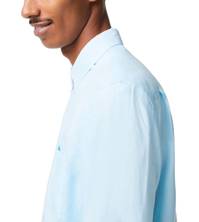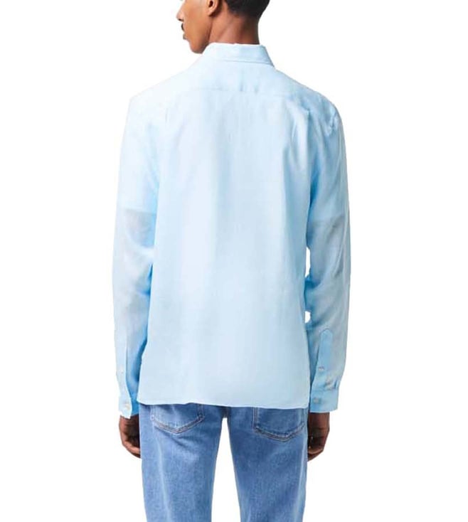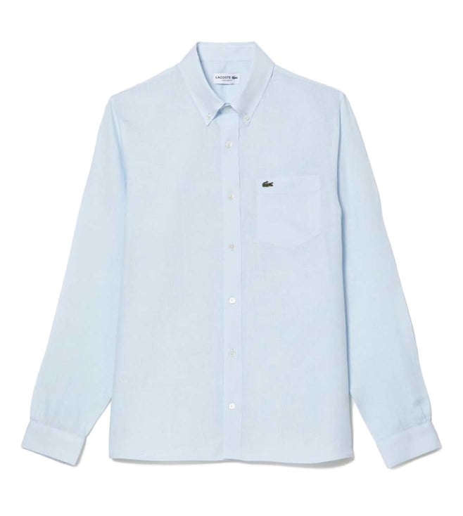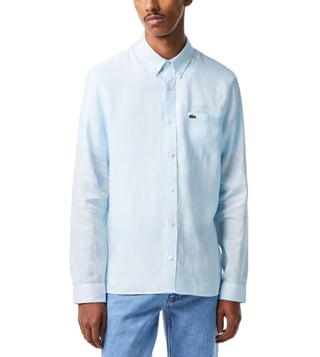 This Men¿s Lacoste Linen Shirt is a regular fit and has straight cut. Naturally chic. It features collar with mother-of-pearl buttons. Classic shirting details. Chest pocket gives a casual touch. Green embroidered crocodile on chest. Basics, signed Lacoste. It is made of linen. Cool in summer, warm in winter. Hypoallergenic.