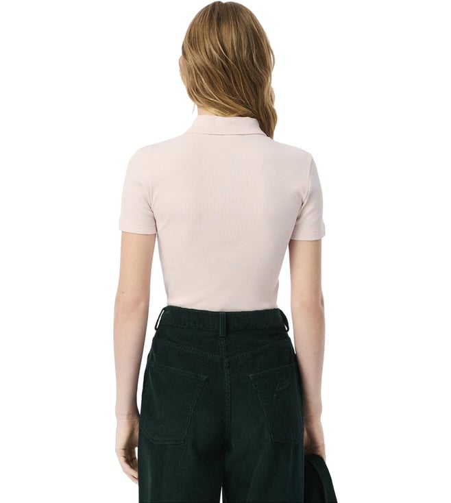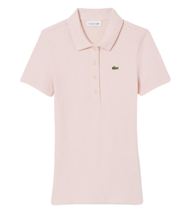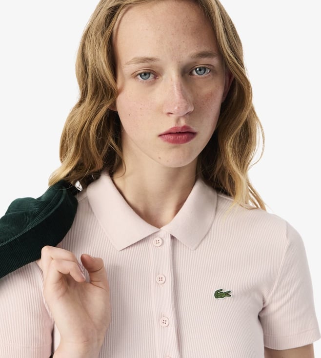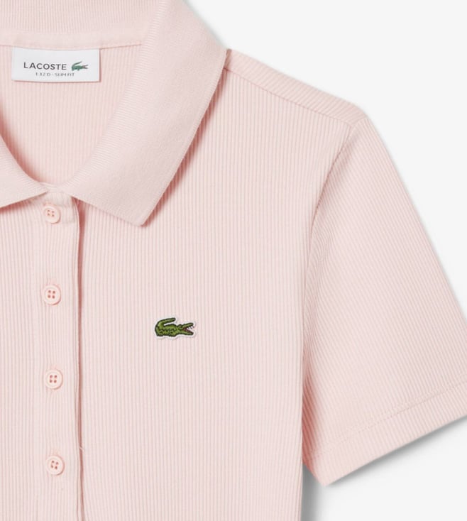 Elevate your casual wardrobe with the Lacoste Pink Ribbed Slim Fit T-Shirt. Crafted from ribbed organic cotton, this slim fit polo shirt features tone-on-tone buttons and the iconic recycled crocodile logo on the chest. With its elegantly fitted waistband and deep button placket, this shirt combines classic L.12.D codes with a comfortable, casual fabric for endless fashion possibilities. Stay stylish and comfortable all day long with this timeless piece from Lacoste.